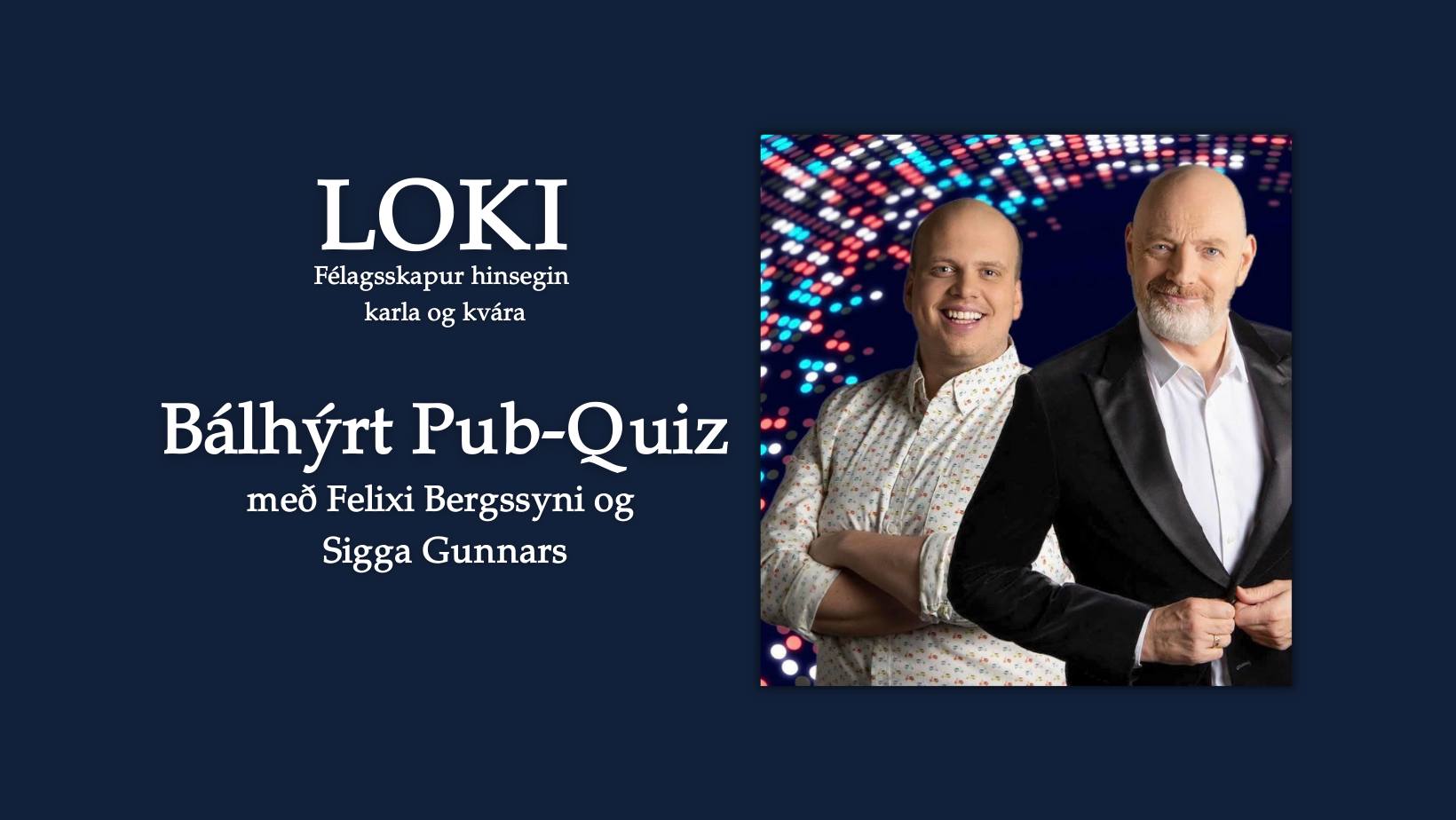 Fylgist með starfsemi Loka á Facebook síðunni: LOKI- félagsskapur hinsegin karla og kvára og nánari upplýsingar um viðburðinn eru á Facebook viðburðinum Bálhýrt Pub-Quiz