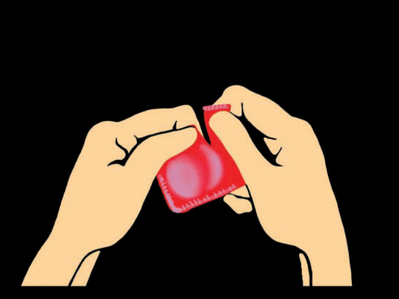 Ýttu smokknum vel til hliðar inn í bréfinu og rífðu það varlega upp. Taktu smokkinn úr bréfinu en passaðu þig á því að neglurnar rífi hann ekki.