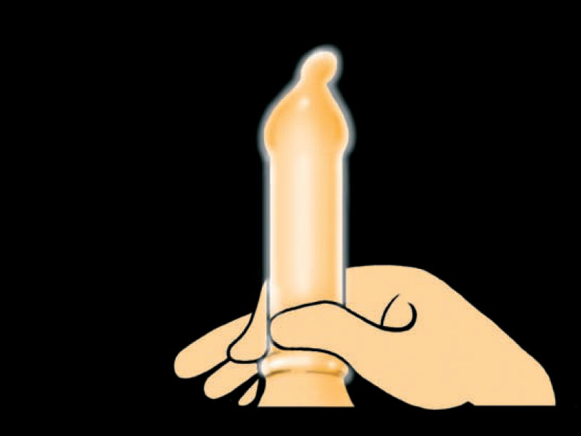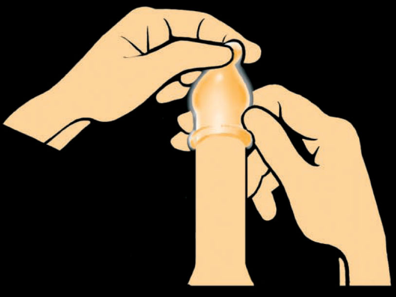 Á meðan þú heldur um totuna með annarri hendinni, ýtir þú forhúðinni vel til baka og rúllar smokknum með hinni hendinni eftir endilöngu typpinu eins langt og þú kemst. Mundu að hafa nóg pláss í lokaða endanum fyrir sæðið.